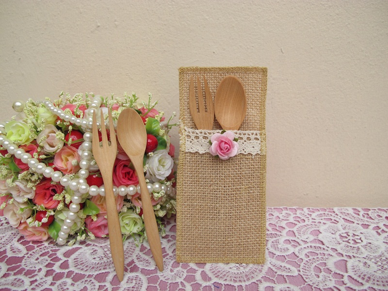 ช้อน และ ส้อม ไม้ ขนาด 12.5 ซม. ใส่ซองผ้าลายลูกไม้ พร้อมป้ายชื่อ ของชำร่วย แต่งงาน